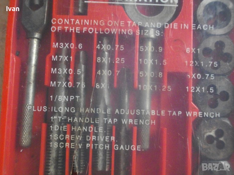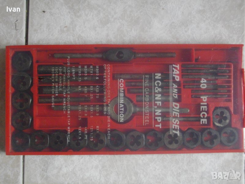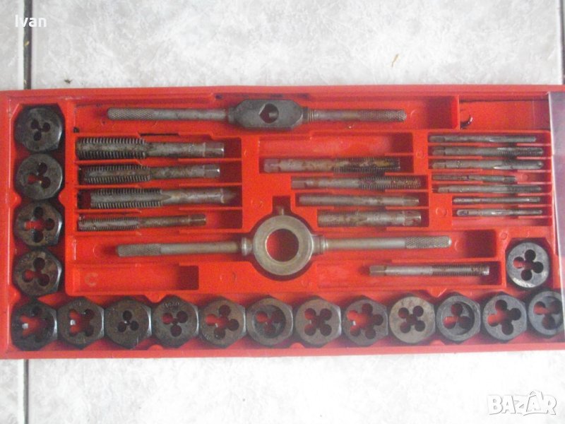 ОПИСАНИЕ на червен голям комплект 35 части - 99 лв. Не е упоменато производство, предполагам немско или френско. Размерите са упоменати да лицевата част на кутията. До размер резби М12. Общо 35 бр. компоненти /държачи, плашки, метчици/. Някои са ползани леко, други са съвсем нови. Всички части са от карбон.Кутията е пластмасова, с прозрачно лице, здрава и се затваря и заключва добре. Размери кутия - 320 х 145 х 25 мм. Тегло - приблизително 1,5 кг.