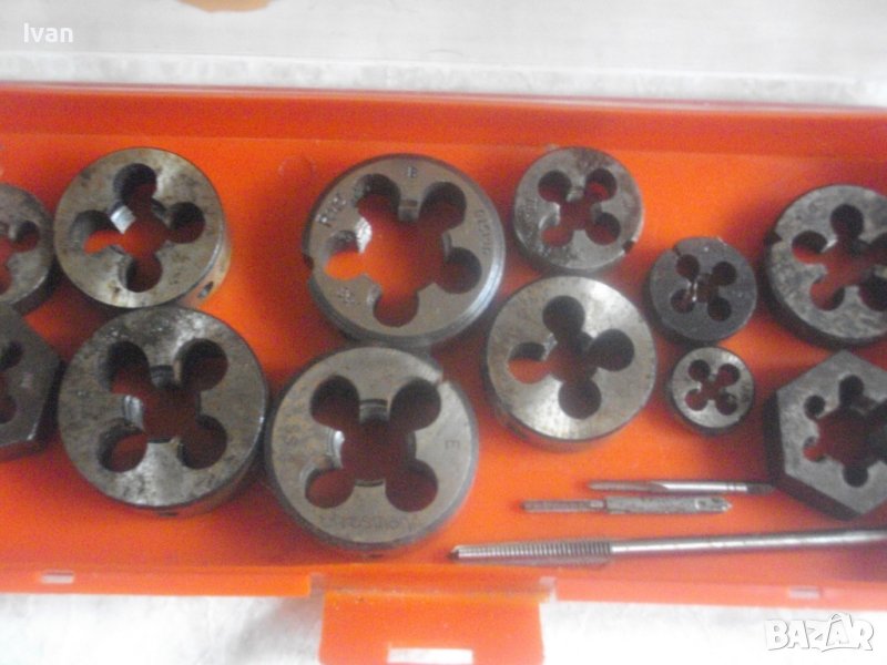 ОПИСАНИЕ на кутия малка червена с 12 бр. големи плашки и 3 бр. метчици - цена 199 лв. Не е упоменато произовдство, предполагам немско или френско. Някои са малко ползвани, други са съвсем нови. Маркови, четат се марки DISTIN, Westfellia, TITAN и др. Плашките са 12 бр общо,размери : М 16 HSS, M 12 , 1/2 , 5/8 , М10 и др.