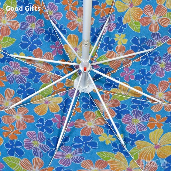 Ветроустойчив плажен чадър 2м, Тъмносин с цветя + калъф за носене