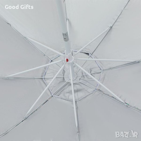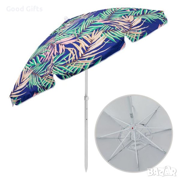 Плажен чадър, ветроустойчив, накланящ се, сини тропически листа, 3 пръстена UV ~50 - 2 м + калъф за носене