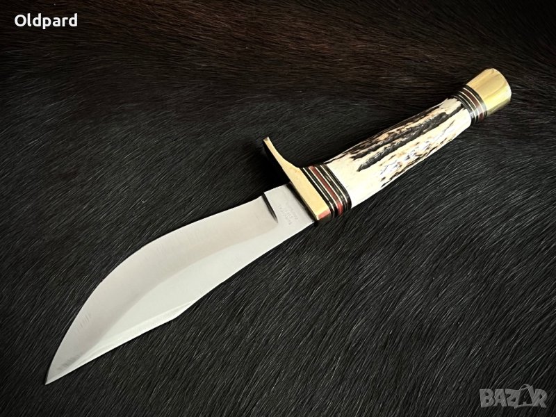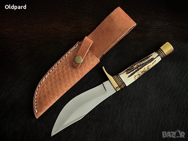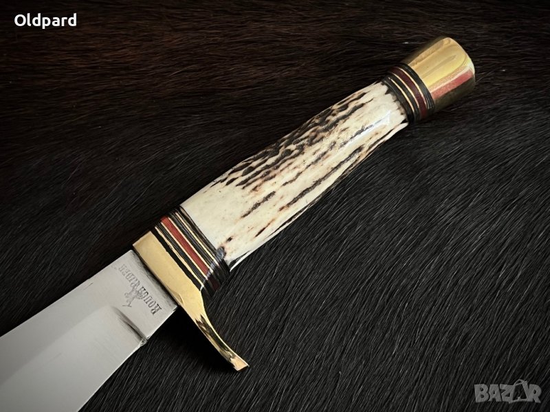 Ловен нож Rough Rider Hunter. Дръжка от еленски рог. Голямото 14 см острие е предназначено за тежка и постоянна работа. Месингов гард и накрайник. Традиционна кожена ножница.