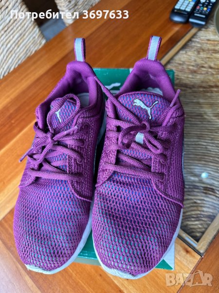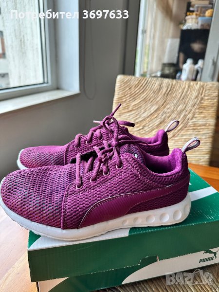 Маратонки “Puma” в красив лилав цвят.Много меки ,удобни и леки.Обувани са веднъж във фитнес зала,няма никакви забележки .На кутията пише ,че са 37ми номер и половина ,но отговарят на 37!