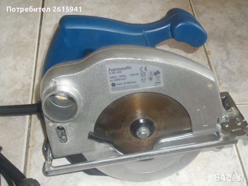 ОПИСАНИЕ на ръчен циркуляр HANSEATIC. Марка и модел Hanseatic H-KS1200. Произовдство - оригинално немско - Germany - 2005 г, производител OBI Germany. Машината е със запазен външен вид, малко ползвана, в добро техническо/работно състояние. Мощност на мотора - 1200 вата, скорост - 4500 об/мин. За дискове размер до ф 160 мм. Поставен на машината оригинален немски режещ диск за дърво с видирани твърдосплавни частици на зъбите ,който е почти нов и в безупречно състояние. Наклон на рязане 0-45 градуса регулируем, дълбичина на рязане регулируема до 50 мм. Автозащита на спусъка. Тегло на машината - 3,5 кг.