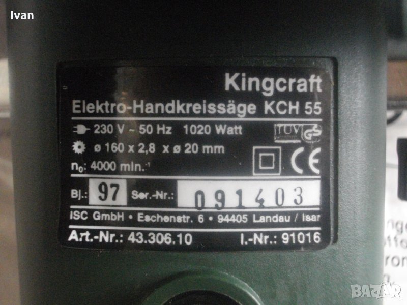 Марка и модел на машината - King Craft KCH 55. Немско оригинално старо висококачествено производство Germany - 1997 г., вписано и маркирано на фабричните стикери на машината. Съвсем нов, неизползван и неупотрубяван. Кашона е отворен за снимките. В отлично техническо/работно състояние. Мощност на мотора - 1020 вата, скорост 4000 об/мин. За дискове размер ф 160 мм. Поставен на машината нов оригинален на марката режещ диск за дърво с видирани твърдосплавни частици на зъбите. Наклон на рязане 0-45 градуса, регулируем. Дълбочина на рязане регулируема 0-52 мм. Четки на машината - външни. Стоманен предпазител на диска с инокс неръждавейка покритие. Стоманен корпус еднокомпонентен със стоманен конектор външен на отпадъчна прах.