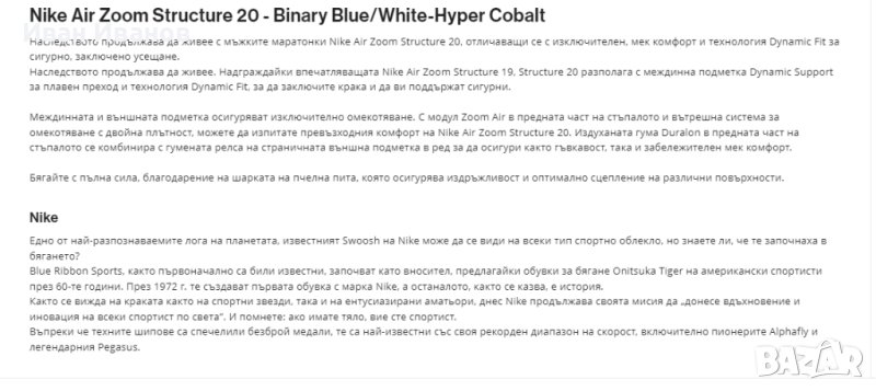 маратонки Nike Air Zoom Structure 20 използвани , с минимални следи , без забележки. Универсален модел за бегачи с прекомерна пронация.Подходящи за спортисти от всяко ниво на подготовка: професионалистите могат да тренират с тях, а начинаещите могат да ги носят за състезания и тренировки.Във версия 20 системата за поддръжка е променена. Подпората на свода е станала по-дълга, както към пръстите, така и към петата. Подобен е на топ модела Odyssey и осигурява повече стабилност.Връзката е станала по-мека около крака, така че маратонките могат да се затегнат по-плътно, без да прищипват крака.Разлика 10 мм. Леки , красиви , удобни Дължина на стелката 28 см Nike Air Zoom Structure 20 (849577-003) - Тази обувка за бягане разполага с влакно Flymesh за подкрепа и дишане. Осигурена е технология Dynamic Fit за плътно прилягане и стабилизация на всяка стъпка. Плоските нишки на Flywire са отговорни за закрепването на крака. Гъвкава, 3-слойна подметка осигурява отзивчива амортизация. Уредът Nike AIR ZOOM ви помага да останете пъргави през цялото време. Материал: текстил, неопрен, композит.