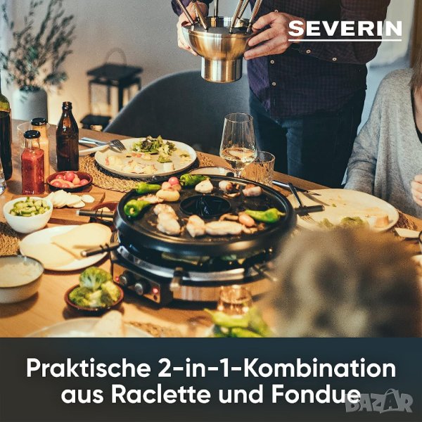 - За партита - с 8 тигана, стъргалки и вилици за фондю, Раклет фондю комбинацията SEVERIN е идеална за празненства или големи групи със семейство или приятели.