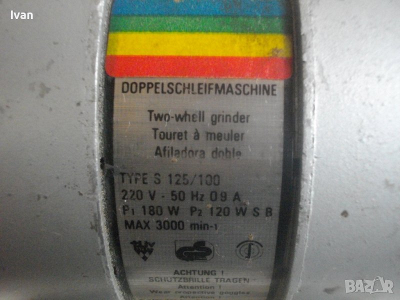 ОПИСАНИЕ на ел.шмиргел Ейнхел - цена 199 лв.. НАЛИЧЕН. Марка и модел - Einhell Type 125 /100. Немско оригинално висококачествено произовдство от преди години. Запазен външен вид на машината и отлично техническо/работно състояние. Без забележки. Вписана мощност на алуминиевата табела на машината P1 - 180 W , P2 - 120 W. 0,9 A. 220 V. 50 Hz. Скорост - макс 3000 об/мин. Машината е от старото качество машини. Размери: дължина 230 мм, ширина 120 мм, Основа на машината - пластмасова с размери 14 х 14 см. Стоманен корпус. Захваната е на дървена стабилна основа 15 см х 25 см. Шмиргела е без странични метални предпазители на дисковете си. Махнати са, за да може да се слагат големи размери камъни/дискове. Поставен на машината в ляво нов голям диск размер ф 210 мм, който е с метална основа по средата и мек зърнест шлифовъчен абразив от двете си страни. Диска е за рязане и за шлайфане. Поставен от дясна страна нов дисков шлифовъчен диск марка Бош/Bosch X-Lock Metal, размер х 125 мм, който е за финно заглаждане на метал, не шлайфане.Тегло на шмиргела с дървената си основа и дисковете - 4,0 кг. Цена 199 лв.