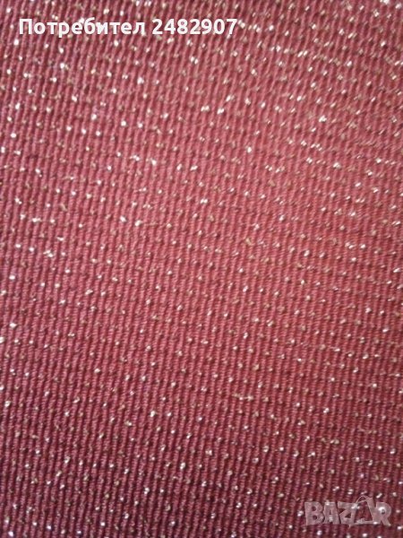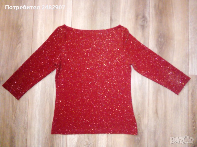 Дамска блуза - бордо със 7/8 ръкав и златист блестящ ефект. Съдържа 45 % полиамид, 45 % полиестер и 10 % еластан. Ширина в раменете - 34 см, ширина под мишниците - 42 см, дължина от рамото до долу - 55 см, дължина на ръкава от рамото - 42 см. Много запазена, почти не е използвана, без забележки.