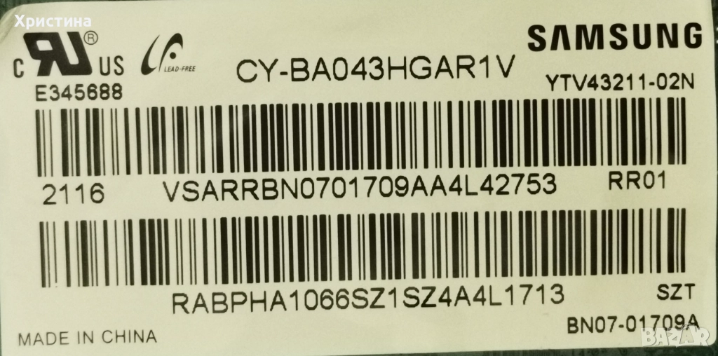 Samsung UE43AU7172U BN9653075F;UE43RU7092U BN41-02703;UE43TU7092U;QE43Q60RAT BN41-02695, снимка 1 - Части и Платки - 41370568 Samsung UE43AU7172U BN9653075F;UE43RU7092U BN41-02703;UE43TU7092U;QE43Q60RAT BN41-02695, снимка 2 - Части и Платки - 41370568 Samsung UE43AU7172U BN9653075F;UE43RU7092U BN41-02703;UE43TU7092U;QE43Q60RAT BN41-02695, снимка 3 - Части и Платки - 41370568 Samsung UE43AU7172U BN9653075F;UE43RU7092U BN41-02703;UE43TU7092U;QE43Q60RAT BN41-02695, снимка 4 - Части и Платки - 41370568 Samsung UE43AU7172U BN9653075F;UE43RU7092U BN41-02703;UE43TU7092U;QE43Q60RAT BN41-02695, снимка 5 - Части и Платки - 41370568 Samsung UE43AU7172U BN9653075F;UE43RU7092U BN41-02703;UE43TU7092U;QE43Q60RAT BN41-02695, снимка 6 - Части и Платки - 41370568 Samsung UE43AU7172U BN9653075F;UE43RU7092U BN41-02703;UE43TU7092U;QE43Q60RAT BN41-02695, снимка 7 - Части и Платки - 41370568 Samsung UE43AU7172U BN9653075F;UE43RU7092U BN41-02703;UE43TU7092U;QE43Q60RAT BN41-02695, снимка 8 - Части и Платки - 41370568 Samsung UE43AU7172U BN9653075F;UE43RU7092U BN41-02703;UE43TU7092U;QE43Q60RAT BN41-02695, снимка 9 - Части и Платки - 41370568 Samsung UE43AU7172U BN9653075F;UE43RU7092U BN41-02703;UE43TU7092U;QE43Q60RAT BN41-02695, снимка 10 - Части и Платки - 41370568 Samsung UE43AU7172U BN9653075F;UE43RU7092U BN41-02703;UE43TU7092U;QE43Q60RAT BN41-02695, снимка 11 - Части и Платки - 41370568 Samsung UE43AU7172U BN9653075F;UE43RU7092U BN41-02703;UE43TU7092U;QE43Q60RAT BN41-02695, снимка 12 - Части и Платки - 41370568 Samsung UE43AU7172U BN9653075F;UE43RU7092U BN41-02703;UE43TU7092U;QE43Q60RAT BN41-02695, снимка 13 - Части и Платки - 41370568 Samsung UE43AU7172U BN9653075F;UE43RU7092U BN41-02703;UE43TU7092U;QE43Q60RAT BN41-02695, снимка 14 - Части и Платки - 41370568 Samsung UE43AU7172U BN9653075F;UE43RU7092U BN41-02703;UE43TU7092U;QE43Q60RAT BN41-02695, снимка 15 - Части и Платки - 41370568 Samsung UE43AU7172U BN9653075F;UE43RU7092U BN41-02703;UE43TU7092U;QE43Q60RAT BN41-02695, снимка 16 - Части и Платки - 41370568 Samsung UE43AU7172U BN9653075F;UE43RU7092U BN41-02703;UE43TU7092U;QE43Q60RAT BN41-02695, снимка 17 - Части и Платки - 41370568 Samsung UE43AU7172U BN9653075F;UE43RU7092U BN41-02703;UE43TU7092U;QE43Q60RAT BN41-02695, снимка 18 - Части и Платки - 41370568 1/18