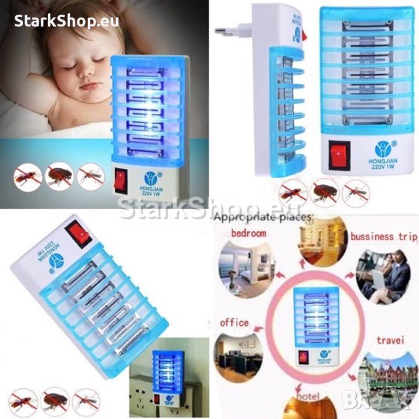 Електрически уред (лампа) против комари за контакт. Електрическият уред е перфектно решение за вашия дом. Той е много ефективен, подходящ за всяка стая и също така може да се използва като нощна лампа. Благодарение на светлината, която излъчва комарите нямат никакъв шанс. Доближат ли се до решетката на лампата, моментално биват изпържвани.