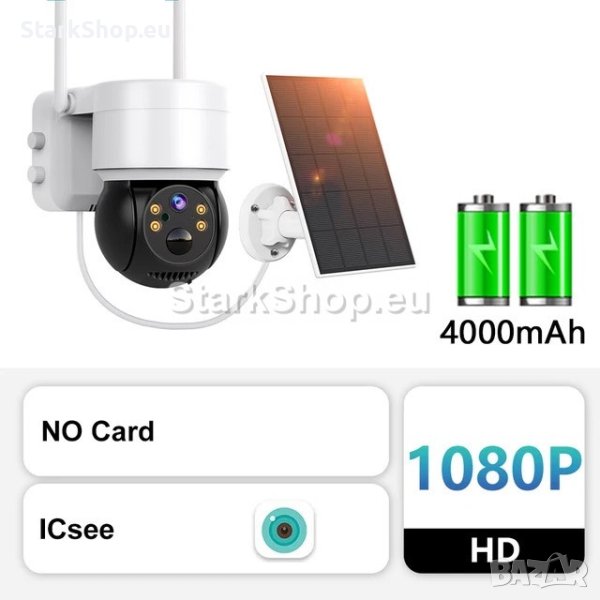 Въртяща камера със соларен панел iCsee 4LED с елегантен дизайн, качествена картина с 4 мм фокусно разстояние и запис директно върху карта памет. Камерата може да се завърти на 350 градуса хоризонтално и на 90 градуса вертикално. Чрез мобилният си телефон можете да контролирате ъгъла на въртене на лентата. Камерата е с вградената Li-ion батерия, която се зарежда от соларния панел. Изключително лесна за инсталация и употреба. Соларният панел може да бъде демонтиран от камерата и поставян на място с по-голям достъп на светлина. Камерата е отлично решение в изграждането на видеонаблюдение в големи търговски обекти, жилищни кооперации, офис сгради, хранителни магазини и други частни обекти. Поради характерната си форма на полусфера камерата е изключително елегантна и се вписва много добре в интериора на всяко помещение.
