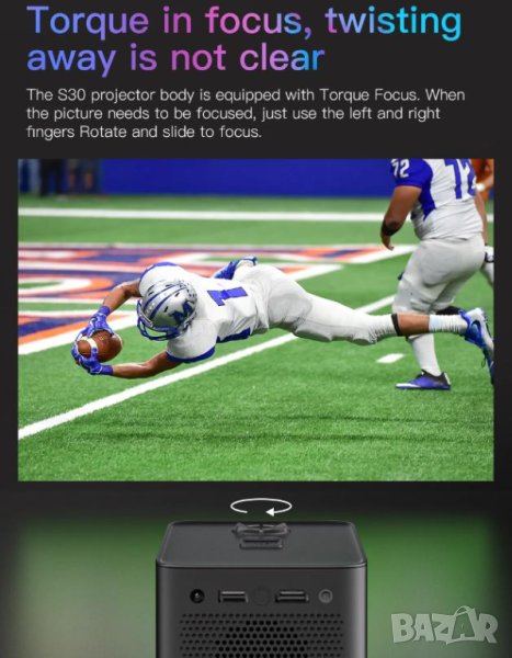 Проектора S30™ MAX® е оборудван с фокусиране на въртящия момент. Когато изображението трябва да бъде фокусирано, просто завъртете и плъзнете на ляво или дясно с пръстчето, за да фокусирате.