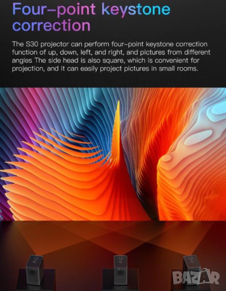 Проекторът S30™ MAX® може да реализира, корекция на трапецовидното изкривяване в четири точки - нагоре, надолу, наляво, надясно, различни ъгли на картината с четири трапецовидни коригиращи функции. Страничната глава също е квадратна за лесно прожектиране и може лесно да прожектира картини дори и в най-малката стая, примерно на 0.5 метра разстояние.