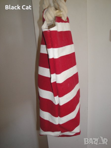 Решена в раиран десен (комбинация от червено и светлобежово), който навява асоциации с плажни емоции. Дръжките визуално наподобяват дебели корабни въжета, което допринася за усещането за море.