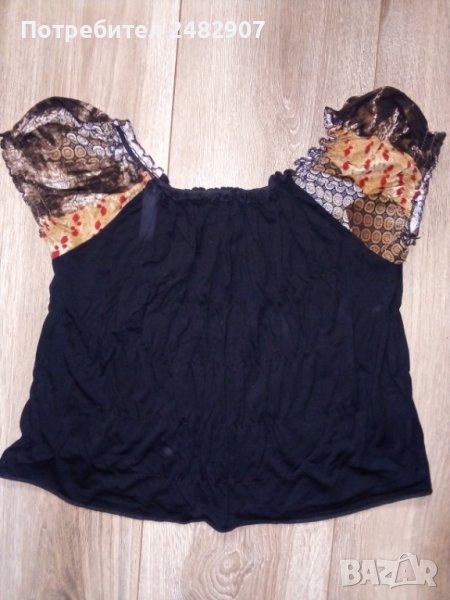 Къса дамска блуза в черно с цветни ръкави, размер S. Ширина в раменете - 28 см, ширина под мишниците - 36 см, дължина от рамото до долу - 39 см, ширина в долната част - 50 см. Запазена, без следи от износване, със забележка - леко разтягане на някои от напречните ластичета.