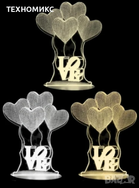 3D ефектът създаден от осветяването на прозрачния акрил, представлява прозрачен шаблон на който е гравирано самото изображение. Тя ще създаде допълнителен уют, топлина в дома или офиса ви и лесно може да се съчетае с всеки един интериор. Предлага се с различни изображения от: Медуза, Айфеловата кула, Коледна елха, Лампа с надпис Love със сърца от балони, Мече с луна, Еднорог.
