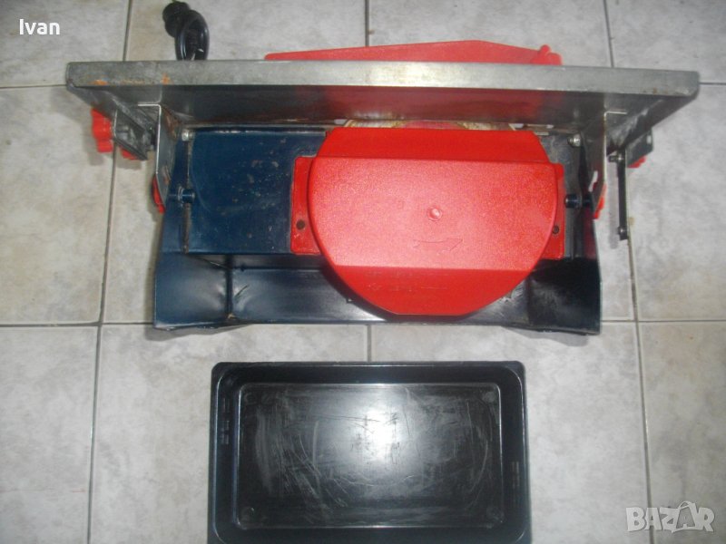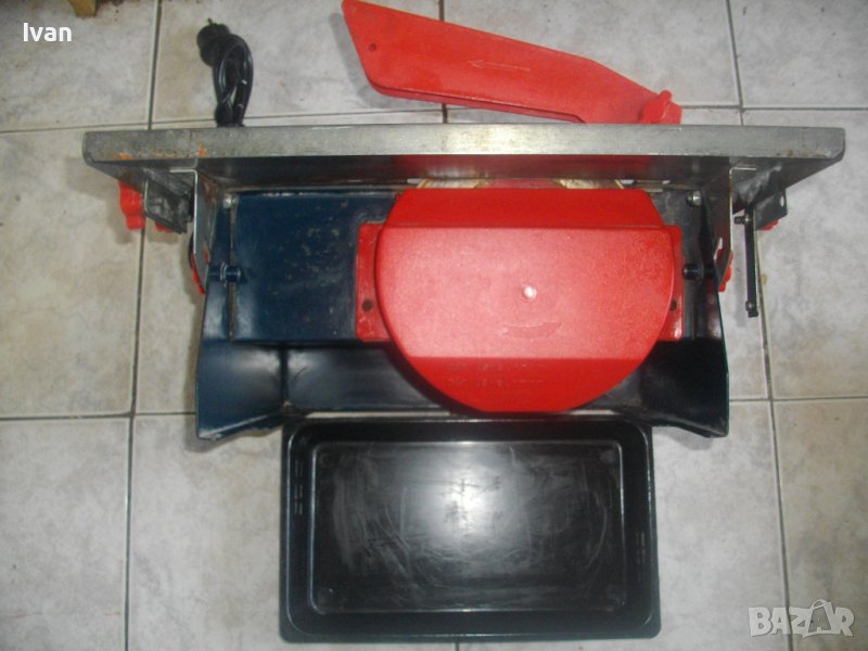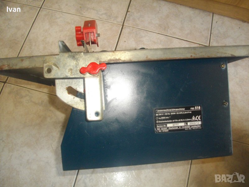 Немска оригинална, производство 2003 г. Клас IP 44. Мощност на мотора 500 вата, 220 волта, защита 2,5 ампера. За дискове размер ф 178 мм. Поставен на амшината оригинален диск диамантина ,който не е износен. С машината е работено, с леко захабен външен вид, но в отлично техническо/работно състояние. Почти безшумна. Скорост 2800 об/мин. Метален плот 39 х 39 см. Наклон на плота рязане ъгъл 0-45 градуса. Наличена еоригиналната вана за вода под диска. Наличен е към машината оригиналния паралел ограничител рязане по ширина на плота. Корпус на машината - метален. Тегло на машината - 11,0 кг.