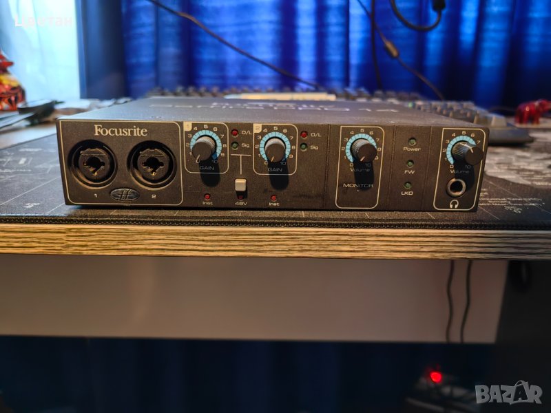 предусилватели Focusrite, които осигуряват превъзходно качество на аналого-цифрово преобразуване, създадени да правят записването и смесването В домашното студио възможно най-ясно. Двата предусилвателя за микрофони Focusrite са специално проектирани за интерфейса на компютъра и базирани на 30-годишно дизайнерско преживяване, осигуряват чист, прозрачен звук с минимален шум и изкривяване. Интерфейсът включва професионална технология за преобразуване (24-битова / 96 kHz) и технология за елиминиране на трептенията JetPLL, която гарантира безупречно качество на звука и надеждна синхронизация; дифузорният миксер / маршрутизатор на Ultra Low Density Saffire MixControl, който осигурява 18 битов DSP миксер с отлична гъвкавост на маршрутизация, интуитивни конфигурации с едно щракване и латентност по-малка от 1,4 ms. Множество входни / изходни опции (включително два Hi-Z инструментални входа и уникална възможност за обмен на звук между софтуерни приложения чрез Saffire MixControl). Той осигурява Plug-in Suite Focusrite VST / AU за използване в пакета за смесване и Xcite +, включващ редица безпроблемни линии и проби, пълнофункционален мек синтезатор и интерфейс Ableton Live Lite 9. Освен това, интерфейсът включва дисплей за тактилен монитор за незабавен контрол над основните стерео изходи, превключваема фантомна мощност за двата микропредавателни входа, софтуер PFL, който позволява на инженера да следи лесно един канал за миксер или пълен микс и специален бъс за предните панели за слушалки. С тактилен контрол на нивото на предния панел. Интерфейсът е напълно съвместим с Thunderbolt, като се използва обикновен адаптер FireWire към Thunderbolt и може да се захранва през бъс чрез FireWire за подредено мобилно устройство за запис (или чрез собствено захранване). Размери: 215 х 45 х 220 мм. Тегло: 1,5 кг.