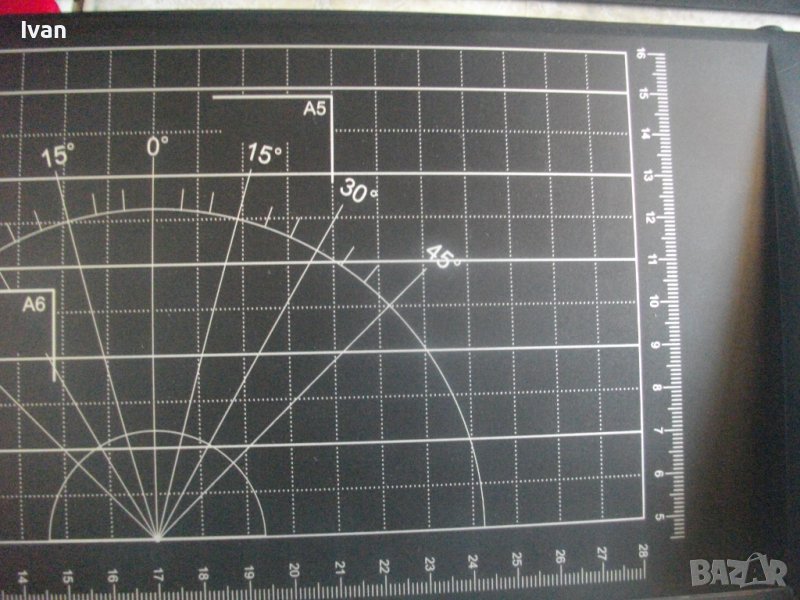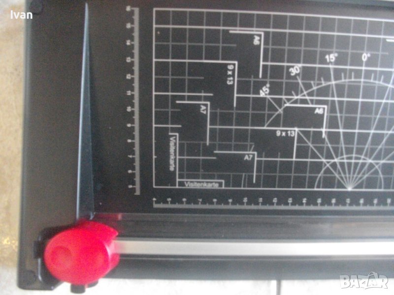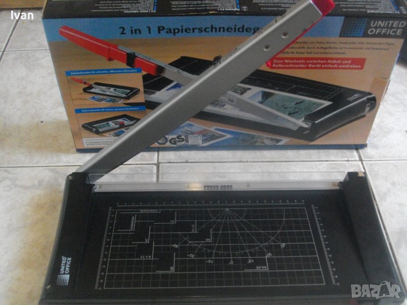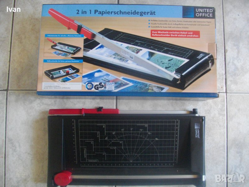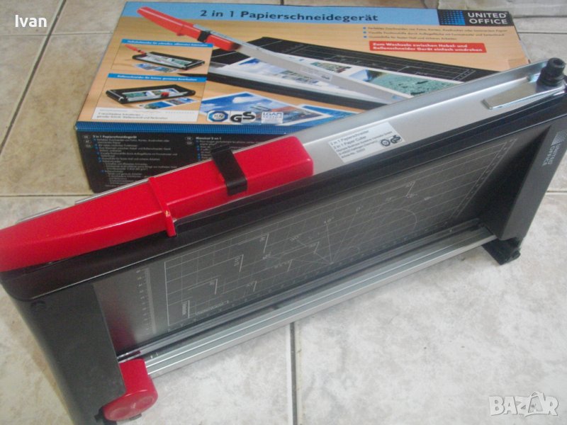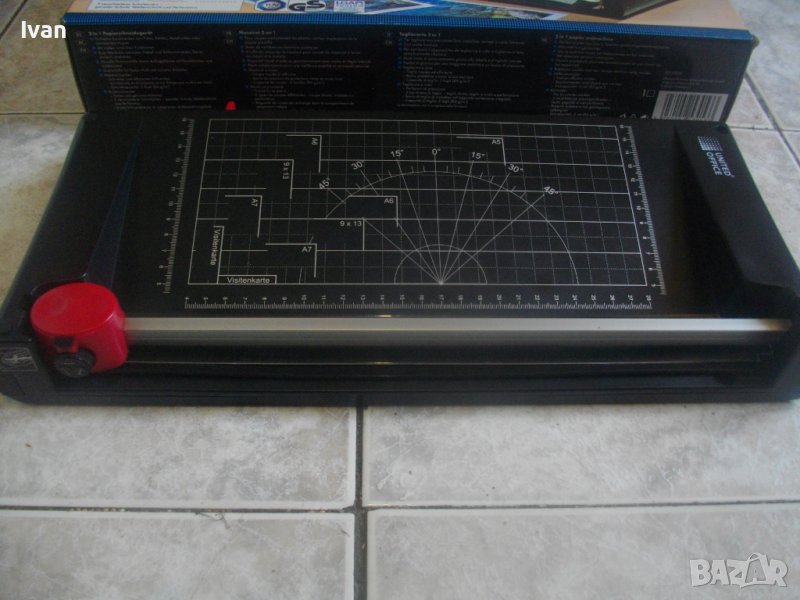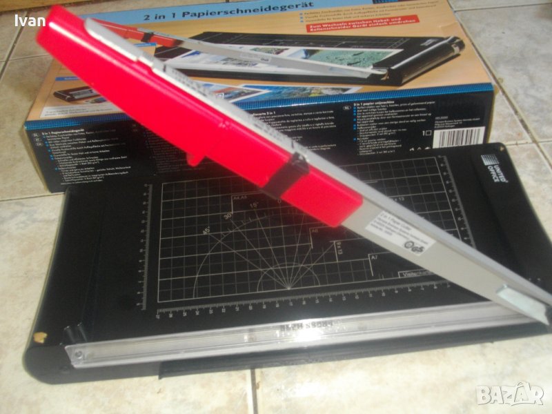 ОПИСАНИЕ на двойна гилотина/ролков нож 2в1 за рязане на хартия/снимки, табак, кадастрон и др.материали. Цена 159 лв. Съвсем нова, неизползвана и неупотребявана. От едната страна инструмента е ролков нож с оразмерявяване на плота за рязане до формат А5, разграфен А5, А6, 9х13, А7, 0 градуса, 15 градуса, 30 градуса, 45 градуса. Разграфен също от 4 см до 28 см и от 4 см до 16 см. Ролковият нож за рязане е сменяем, придвижва се посредством натискане върху него. Алуминиева шина водач на ножа, пластмасов ограничител на поставената за рязане хартия.
