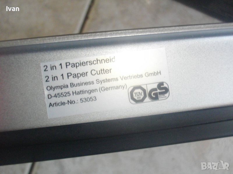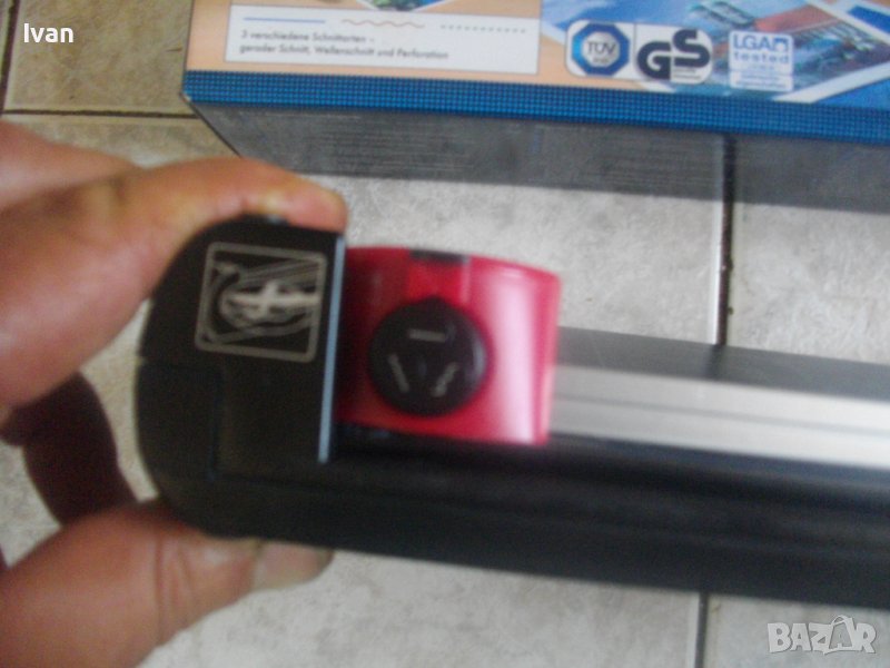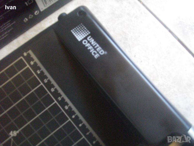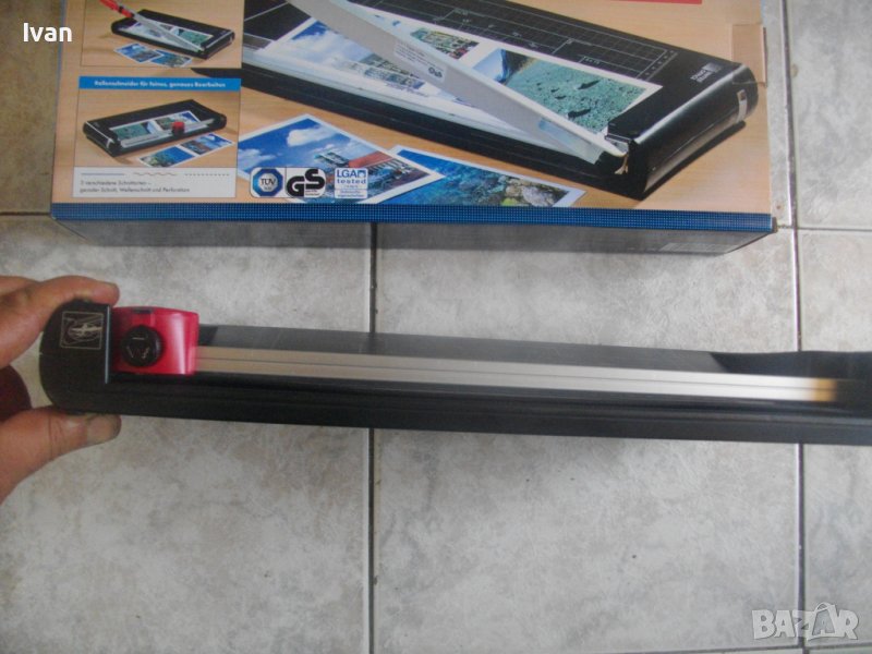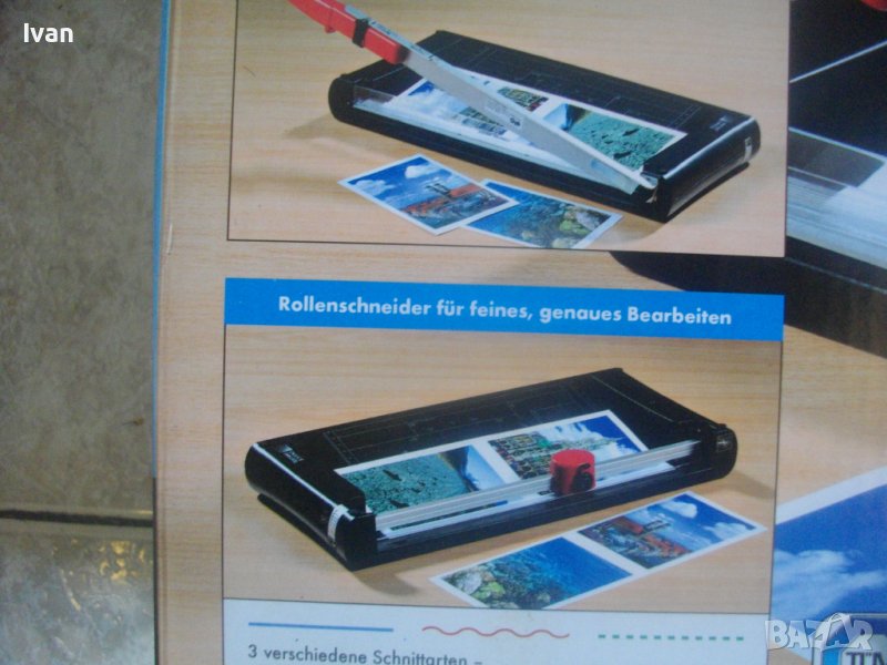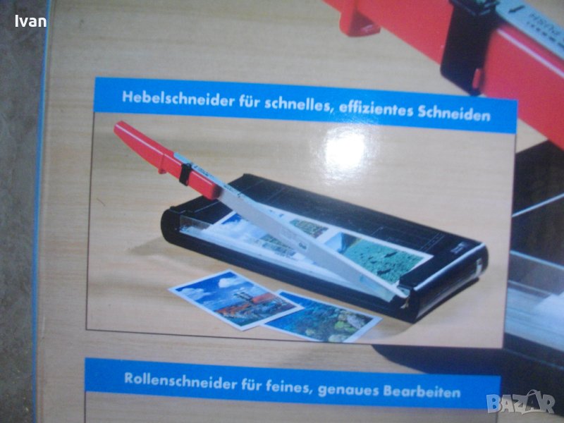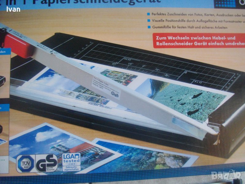 ОПИСАНИЕ на двойна гилотина/ролков нож 2в1 за рязане на хартия/снимки, табак, кадастрон и др.материали. Цена 159 лв. Съвсем нова, неизползвана и неупотребявана. От едната страна инструмента е ролков нож с оразмерявяване на плота за рязане до формат А5, разграфен А5, А6, 9х13, А7, 0 градуса, 15 градуса, 30 градуса, 45 градуса. Разграфен също от 4 см до 28 см и от 4 см до 16 см. Ролковият нож за рязане е сменяем, придвижва се посредством натискане върху него. Алуминиева шина водач на ножа, пластмасов ограничител на поставената за рязане хартия.