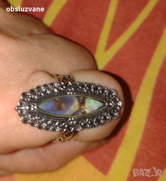 Уникален моден блестящ пръстен-халка в антично обработено покритие от стерлингово сребро с елипсовиден камък имитиращ седеф.