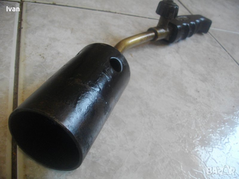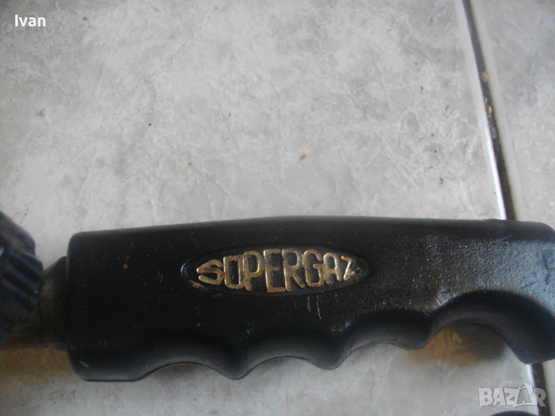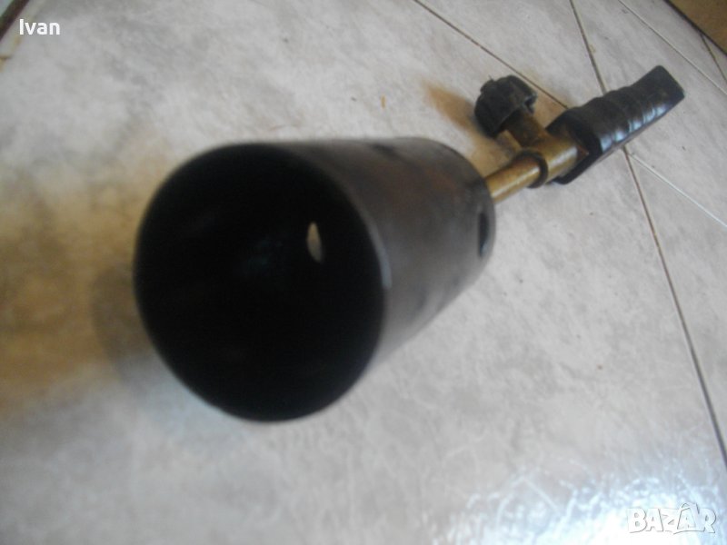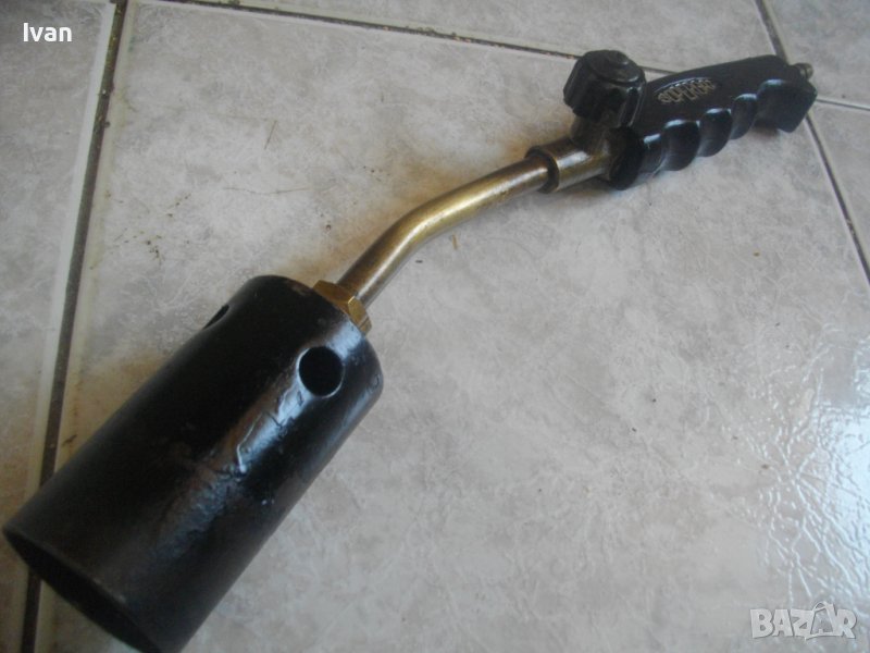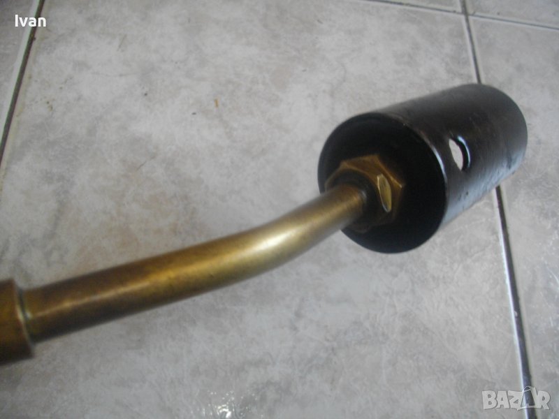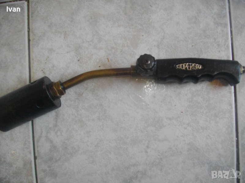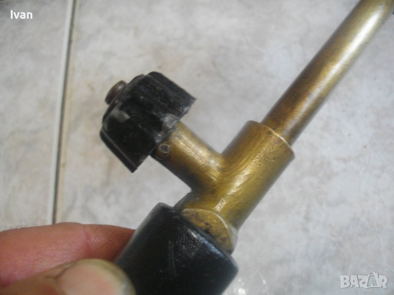 ОПИСАНИЕ на горелка къса за газ пропан.бутан - 129 лв. Марка SUPERGAZ. Произовдство не е упоменато. Дължина цялостна - 375 мм. Бронз тяло, с бронзова тръба и бронзов адаптер връзка отзад за скачване с маркуч за скоба. Алуминиев спирателен кран върток. Чашка масивна метална от дебело желязо. Диаметър на чашката - ф 50мм, с 1 дупка за пламъка.Запазен външен вид и добро техническо/работно състояние.