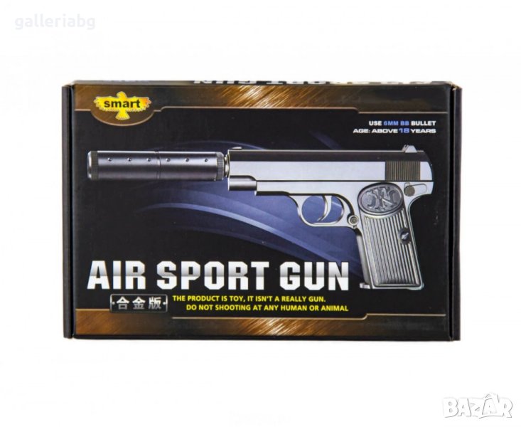 Пистолет Браунинг с мини заглушител е висококачествен модел пружинен пистолет, изработен от висококачествена цинкова сплав и пластмаса. Началната скорост на изстрела на топката е 50-59 метра в секунда.
