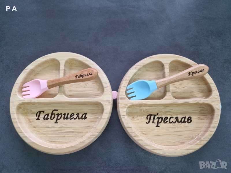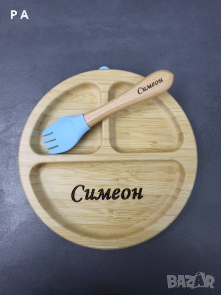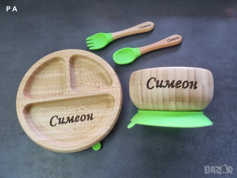 Бамбукова купичка и чинийка с три отделения със силиконова не плъзгаща се основа. Лъжичка и виличка с мек хранителен силиконов връх.