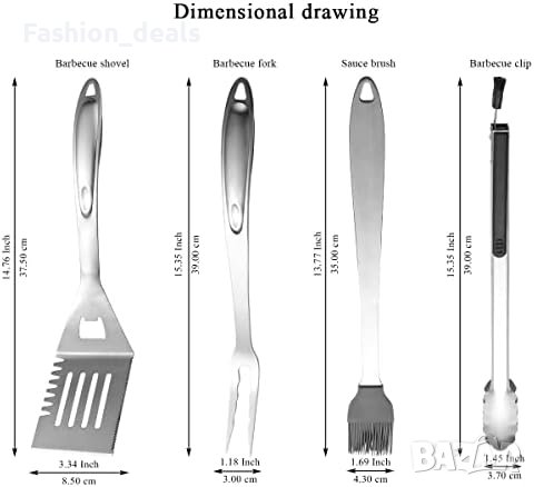 Комплект от 4 части: мултифункционална лопатка, вилица, четка за масло и щипка за грил.