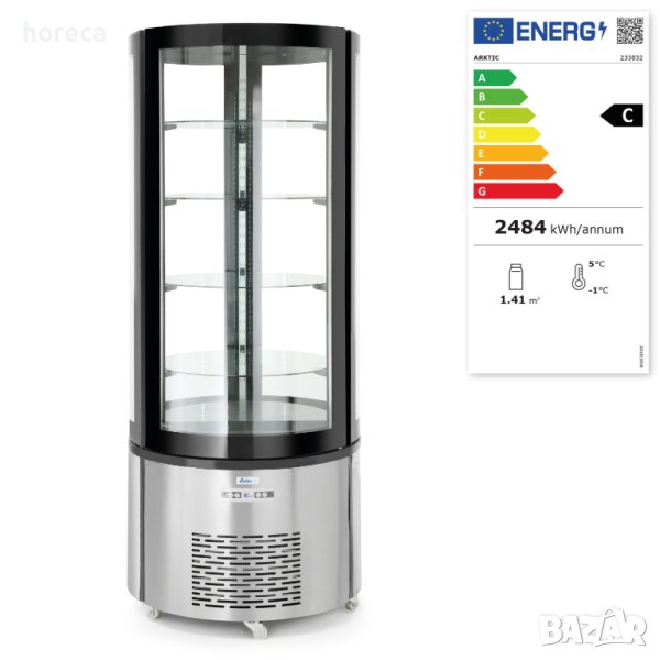 Температурата се контролира чрез дисплей и цифров контролер, който позволява настройка в диапазона от 0°C до 6°C. Кръгла витрина за торти с 4 рафта - 360л. Тя е класифицирана в Климатичен клас 4 и използва екологичен хладилен агент R290.