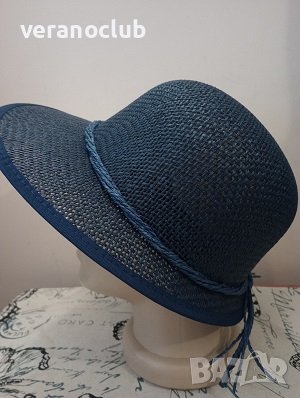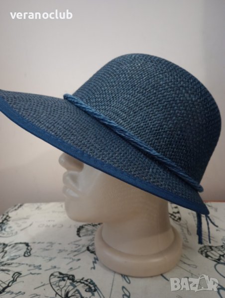 Синя лятна дамска капела с оформена периферия, изразена в предната част. Размер на шапката по етикет 56 см. Регулируем размер от вътрешната страна чрез монтираните шнурчета.