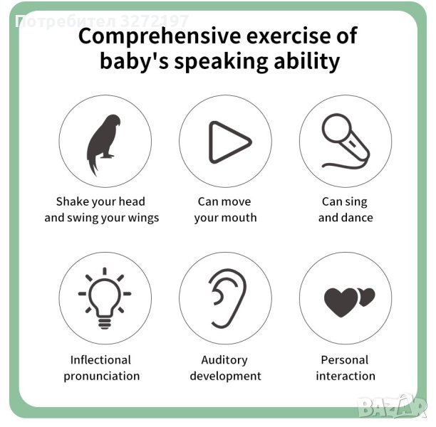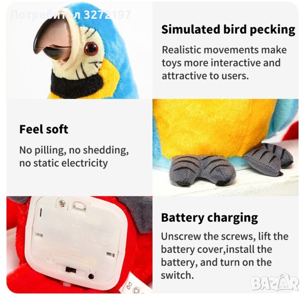 Tози папагал има вграден високоговорител и микрофон, които му позволяват да пее, танцува и да се учи да говори. Освен това има функция за запис, която позволява на децата да записват собствените си гласове или гласове и да ги възпроизвеждат. Може също да танцува на музика и има функция за запис, което позволява на децата да запазват своите музикални творения , има сладко и приятелско лице, което може да взаимодейства с децата чрез технология за разпознаване на реч и също така има функция за запис, която позволява на децата да