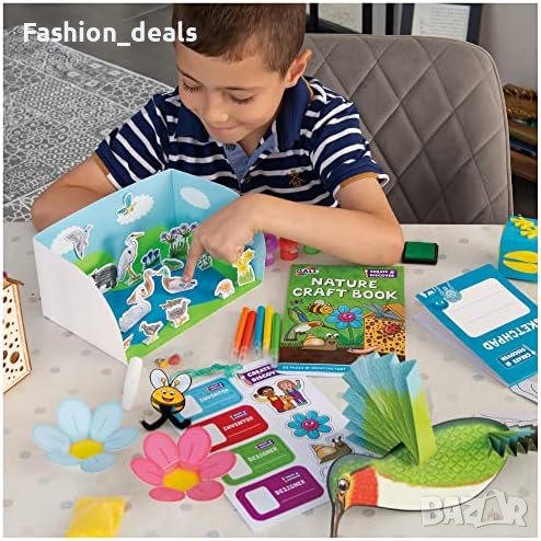 Подходящ за деца над 5 години Подпомага ранното STEAM обучение и творческото мислене Комплектът включва 20-странична цветна проектна книга с 6 занимателни дейности Изработете летящо водно конче, отпечатвайте следи, създайте къща за буболечки Създайте 3D местообитание на езеро и висящ модел на колибри Научете как пчелите опрашват цветята