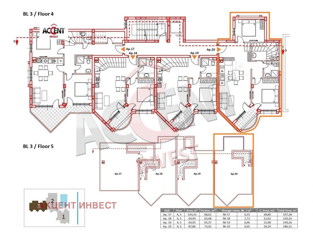 код: 20749 Акцент Инвест представя на Вашето внимание панорамен пентхаус с две спални, разположен в бутиков жилищен комплекс на брега на морския бряг край Кабакум. Апартаментът се помещавана 4-ти и 5-ти жилищен етаж с площ от 186,11кв.м. и има следното разпределение: