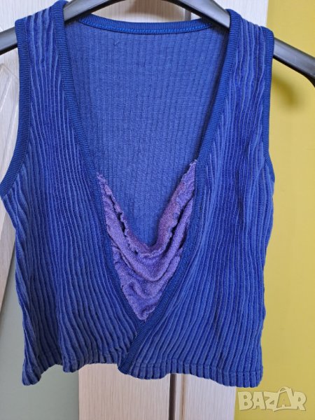 Дамска къса синя блуза с платка деколте, материя 95 % памук и 5 % ликра. Размер S-М, 40-44 см /или обиколка 80-88 см/, има еластичност, дължина 42 см. Отговарям на съобщения тук, изпращам с куриер с отстъпка, преглед и тест, или лично предаване в София.