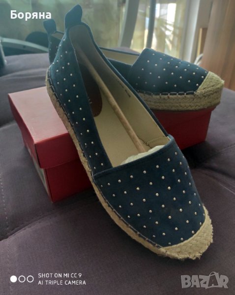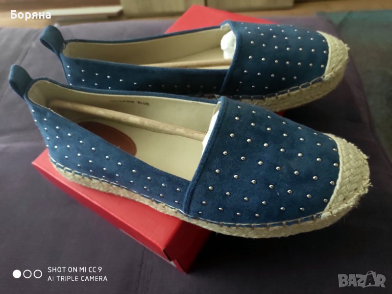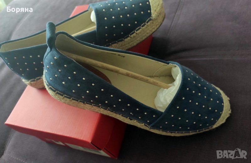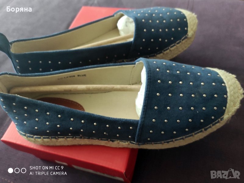 Чисто нови дамски еспадрили в имитация от деним тип текстил с малки сребристи капси и основа от рафия. Много леки, идеално за летния сезон. Размер 38, отговарят си.