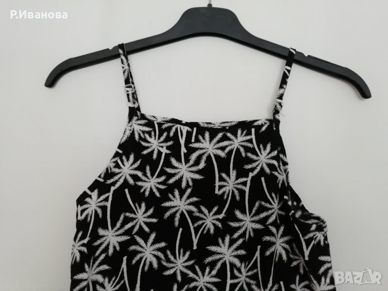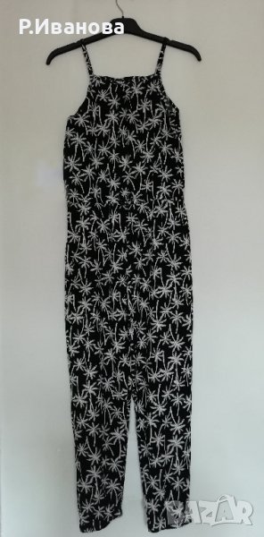 Дамски гащеризон, черен с бели палми, с презрамки, лека и приятна материя, подходяща за лятото. Дължина 125 см.+10 см. презрамки, мишници - 38 см, ханш - 46 см, тария на ластик, разтяга се до 40 см.
