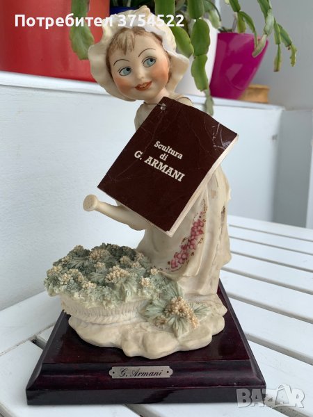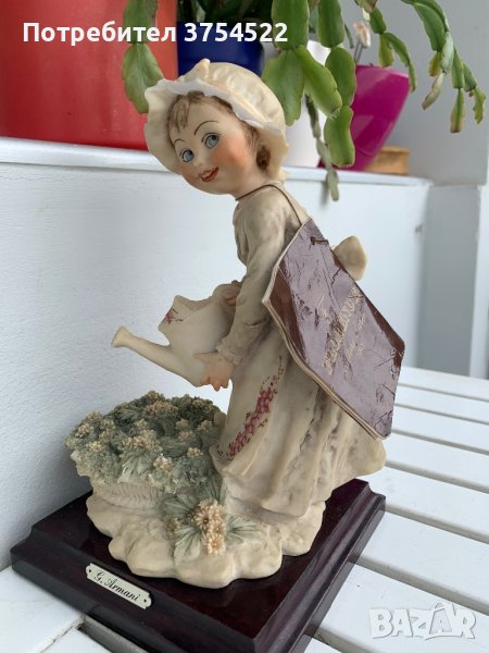 Capodimonte полирезинова фигура на момиче поливаща цветя създадена от Giuseppe Armani, всички маркировки и сертификат налични. За съжаление със забележки - има отчупено от периферията на шапката в лицевата част, както и малко отчупено в задната част на елемент от роклята.