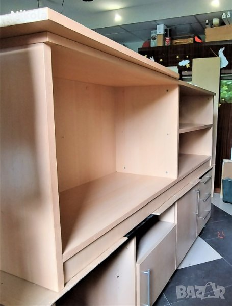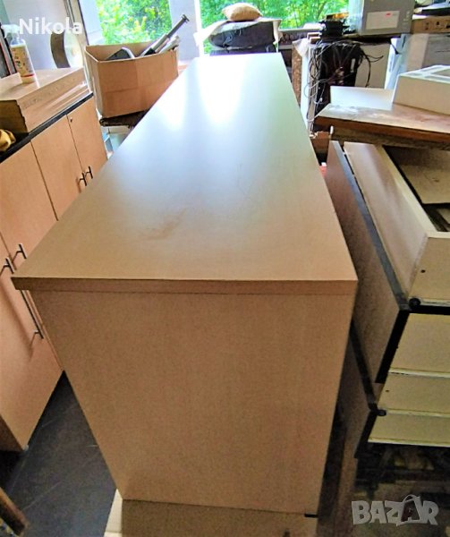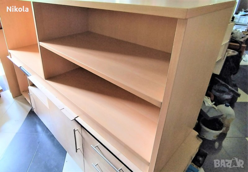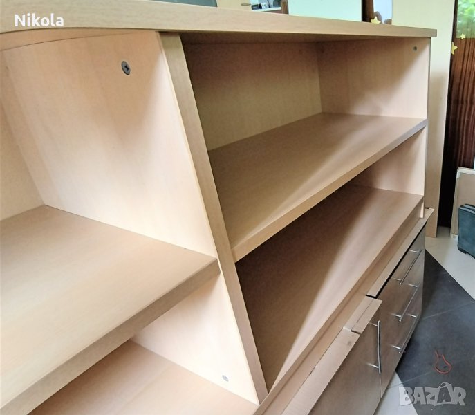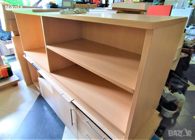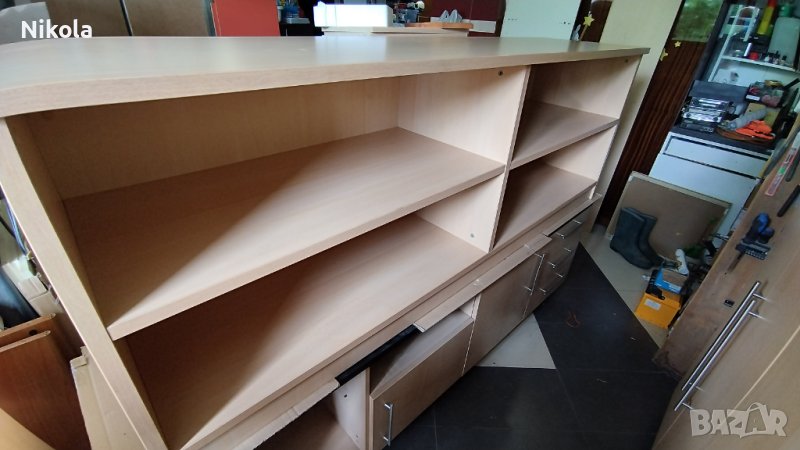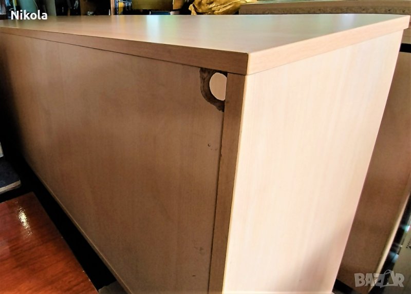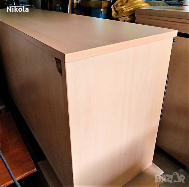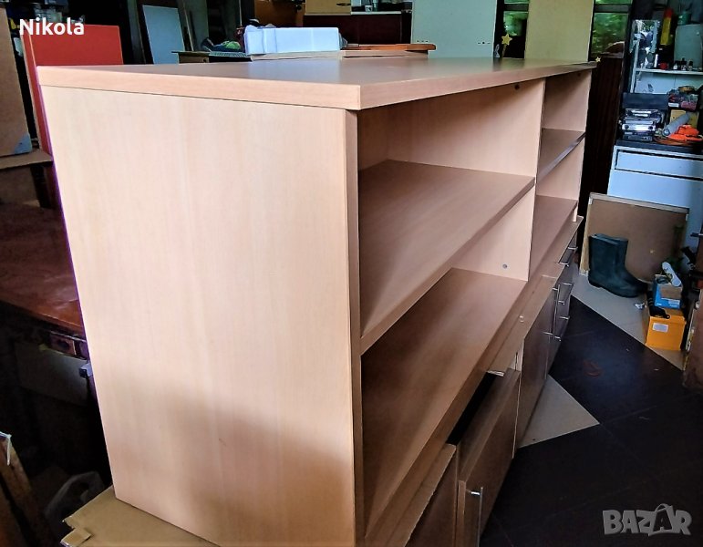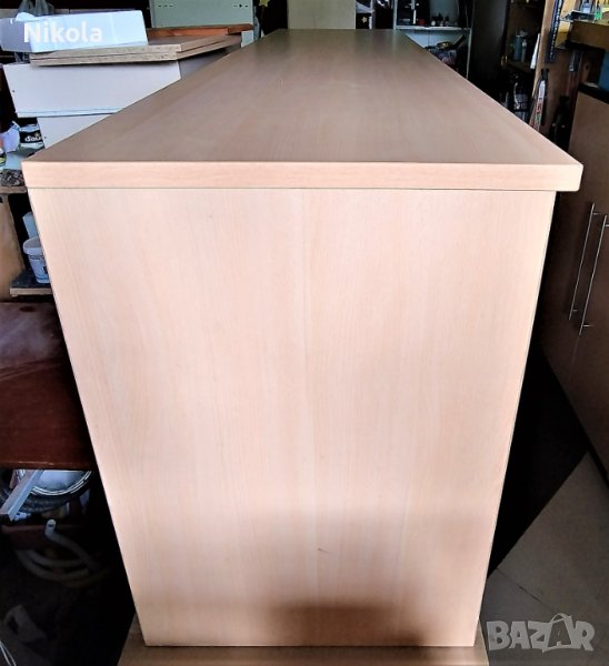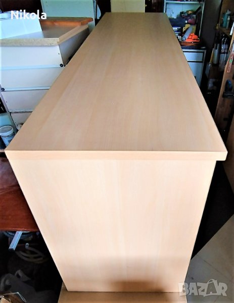 Продавам голям офис шкаф цвят бук размерите са ширина200см / дълбочина 50см/ височина 73см. Шкафа е здрав с минимални следи от употреба като дребни драскотини. Плоскостите са с дебелина 2,5см както за корпуса така и рафтовете и всичко е кантирано с дебел кант. Шкафа няма врати но е доста тежък .