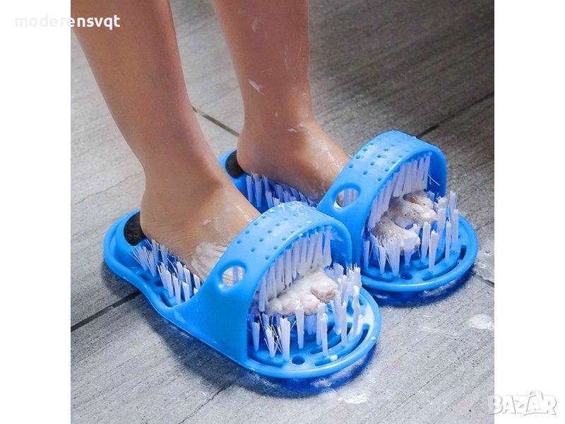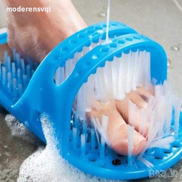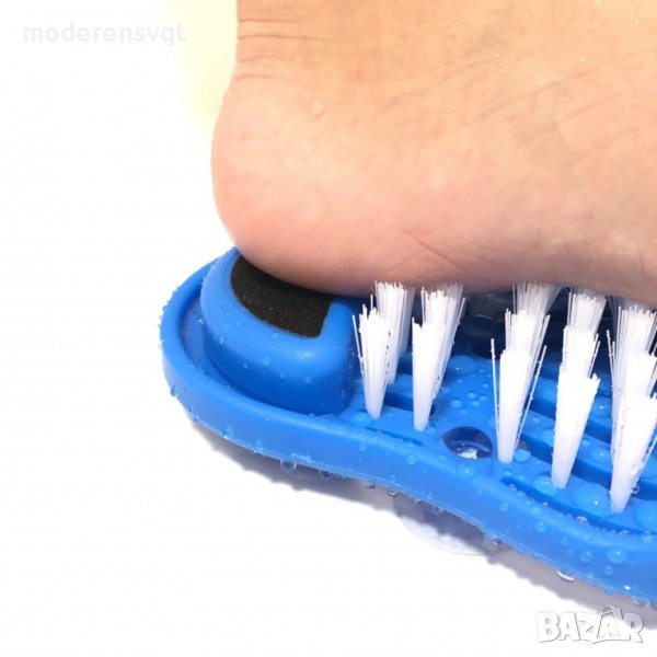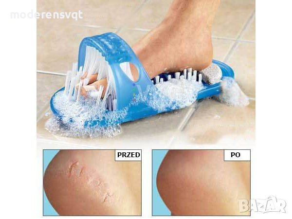 баня. Четка за почистване, масажиране и ексфолиране на ходилата без навеждане. Иновативна четка за крака под формата на чехъл. Четката има вградена пемза, с която лесно ще поддържате меки и гладки пети. Закрепва се с помощта на 9 вендузи, които държат здраво чехъла, където и да го поставите в банята. Лесен за употреба, подходящ за всички възрасти. И всичко това лесно и безопасно, без навеждане и упорито търкане, без да се налага да стоите на един крак, докато почистите другия. А масажирането на крака е един приятен бонус и, естествено, предимството, че не се налага да се навеждате.