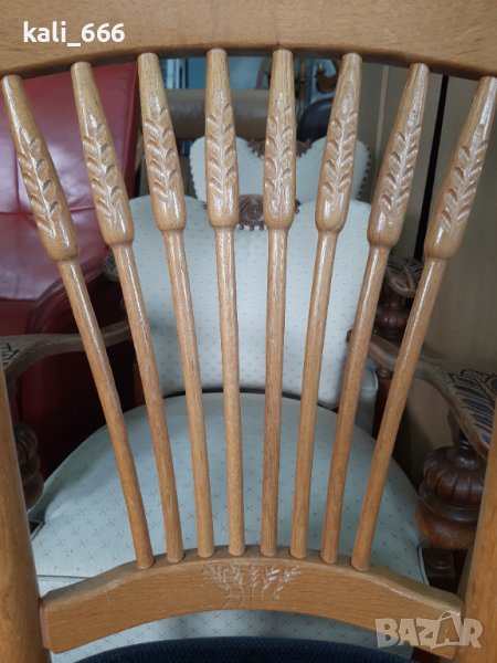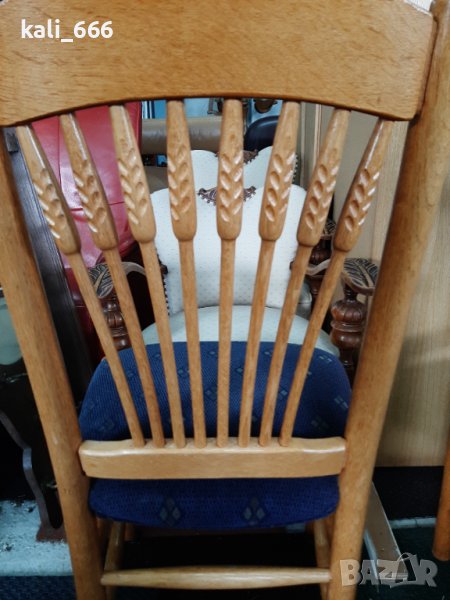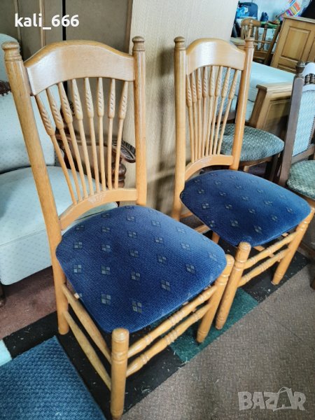 Комплект от 2 броя трапезни столове, изработени от масивно дърво и декорирани с резби. В добро състояние с нормални следи от употреба. Посочената цена е за брой, не се продават поотделно. Закупени от Холандия.