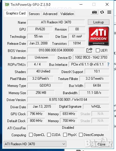 Продавам видео карта AMD HD3470 256MB GDDR3 64Bit VGA DVI HDMI PCI-E → Обява 41433909