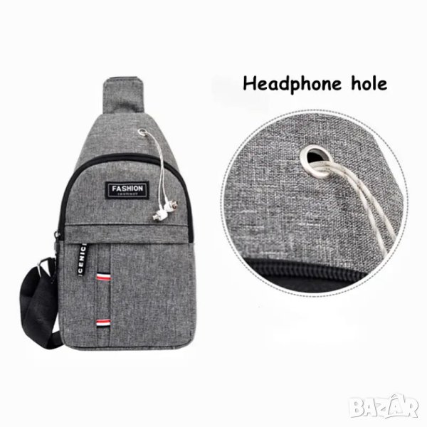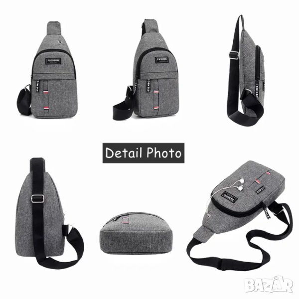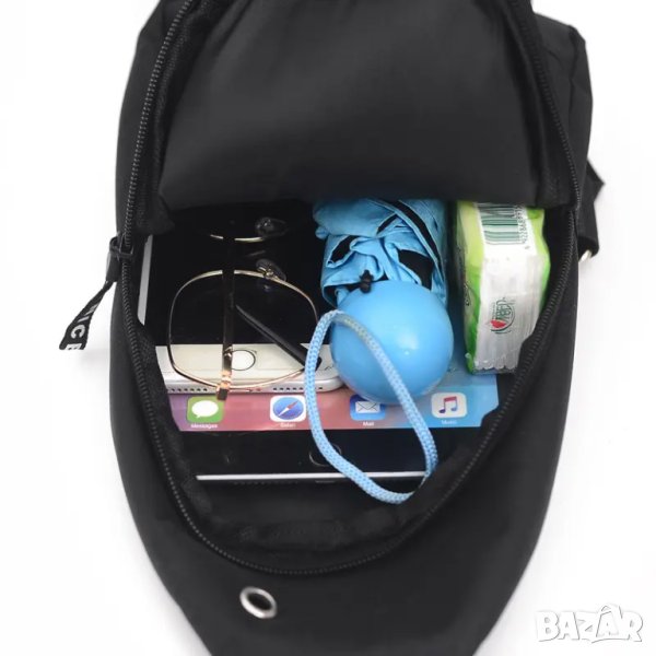 Мъжка чанта-раница от здрав плат за носене през гърди, на рамо или на гръб, с регулираща се дръжка. Мъжката чанта е с едно основно отделение и с преден джоб с цип.