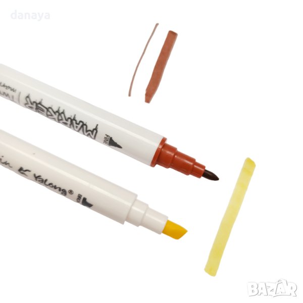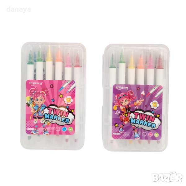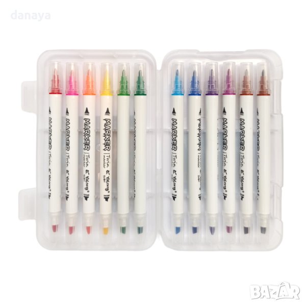 Цветни флумастери за рисуване и оцветяване. 12 двустранни цвята – от едната страна са класически тънък връх, а от другата флумастерите са тип маркер за дебело очертаване. Подходящи са за ученици, деца в детската градина и домашно ползване. В пластмасова кутия за лесно съхранение.