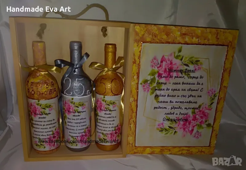 Бутилки за наричане с фолклорни/ народни мотиви в голяма дървена кутия- подарък за младоженците от кумове, родители, близки, роднини, приятели.
