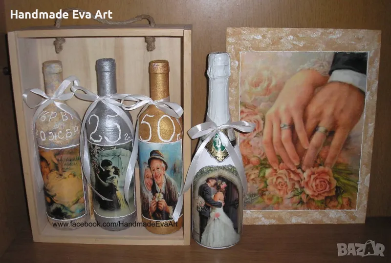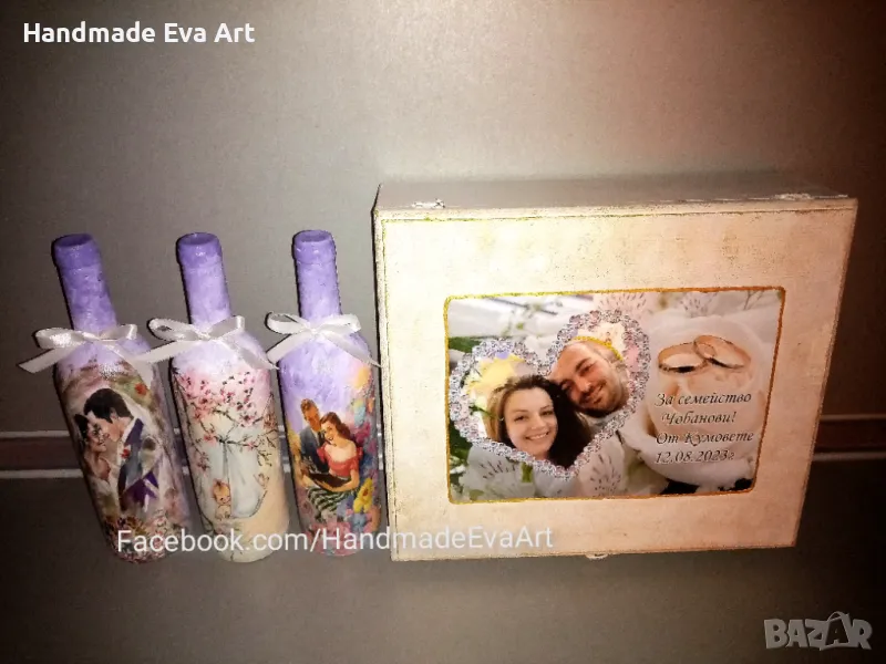 Може и изписване имената на младоженците и дата на сватбата върху бутилките или кутията.
