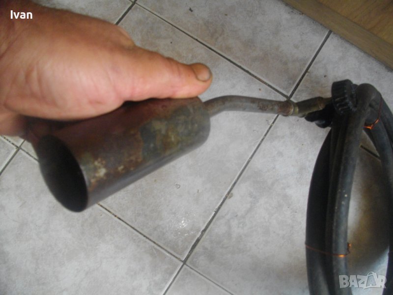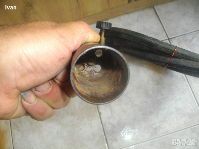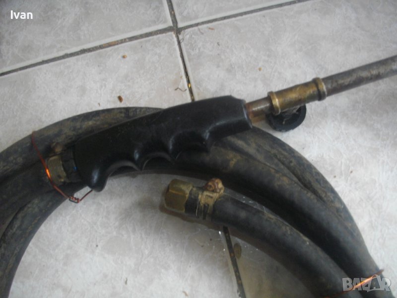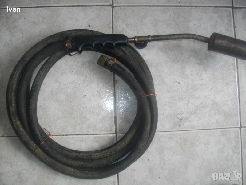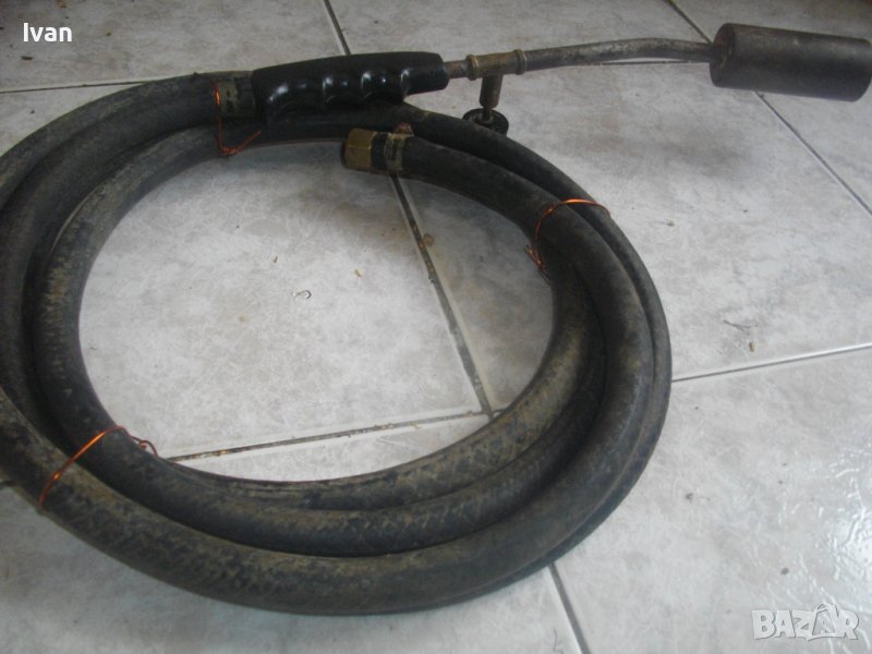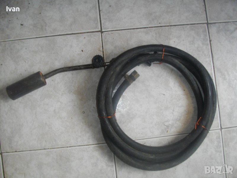 ОПИСАНИЕ на горелка газова с черен маркуч - 139 лв.. Старо качество, немско произовдство. Много запазен външен вид и отлично техническо състояние. Масивен дебел гумиран маркуч ф 20 мм. Маркуча е отличен, без напуквания и без наранявания. Дължина 2,5 м. Присъединителна гайка щуцер ф 20 мм на свободният си край. Горелка - масивна, дължина 380 мм, масивен накрайник отпред ф 40 мм с 5 дупки за пламъка. Спирателен кран на корпуса.