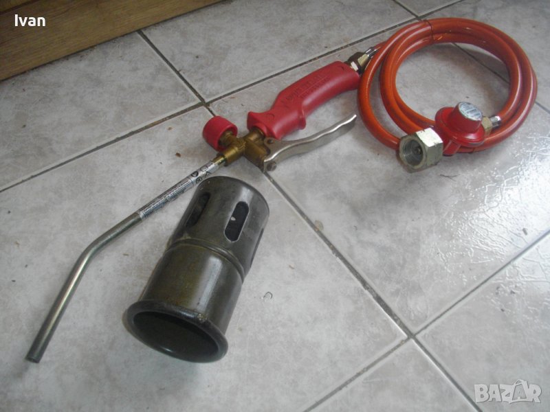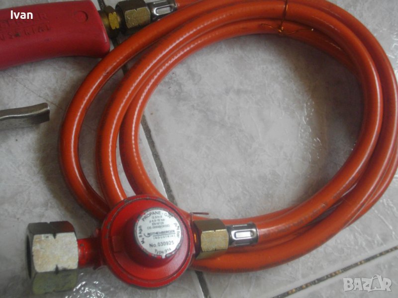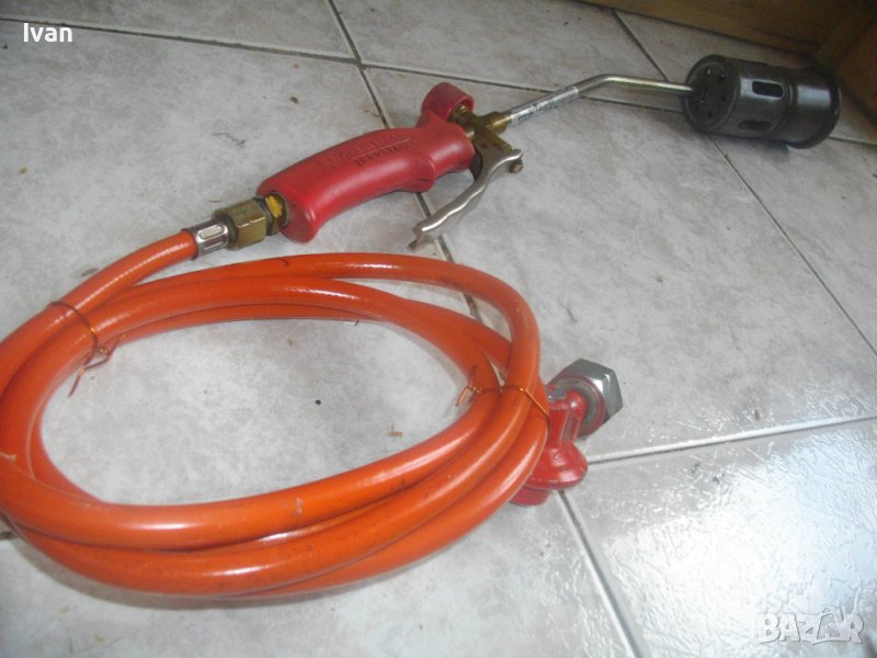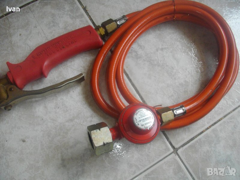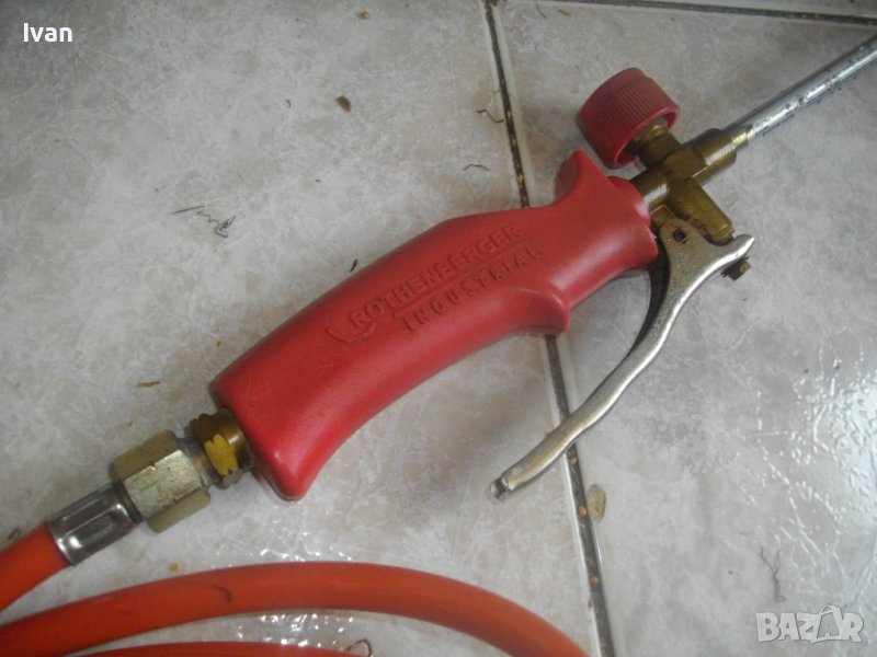 ОПИСАНИЕ на червена горелка за покриви/хидроизолации - Ротенбергер. Професионална немска. Почти нова, с много запазен външен вид и отлично техническо/работно състояние. Марка ROTHENBERGER.Дължина на горелката - 580 мм, контактна дюза накрайник отпред ф 70 мм, с 9 дупки за пламъка, масивна. Наличие на дълъг, удобен спусък стоманене на горелката. Пластмасово ,нехлъзгащо се покритие на дръжката. Маркуч оригинален 2,5 м, на резба. Отличен. Поставен оригинален редуцир вентил червен за газ пропан.бутан - почти нов, 4,5 - 16 бара налягане.