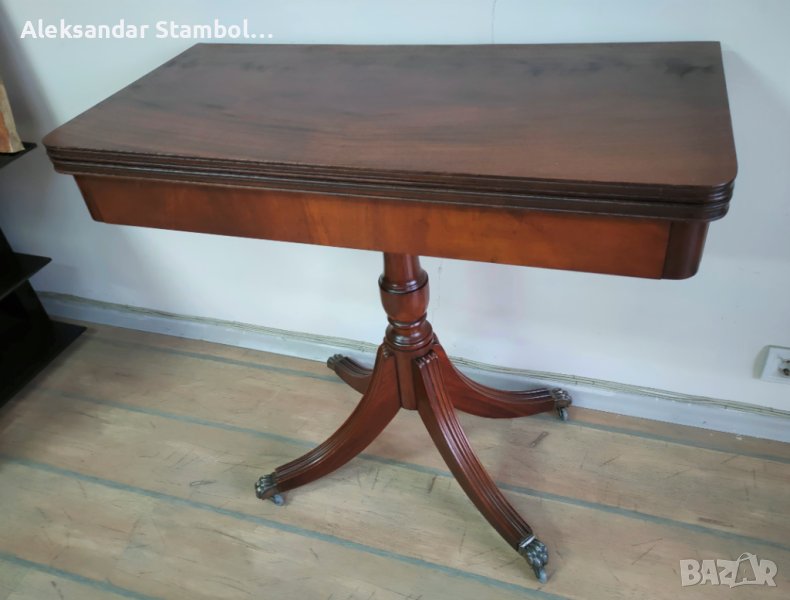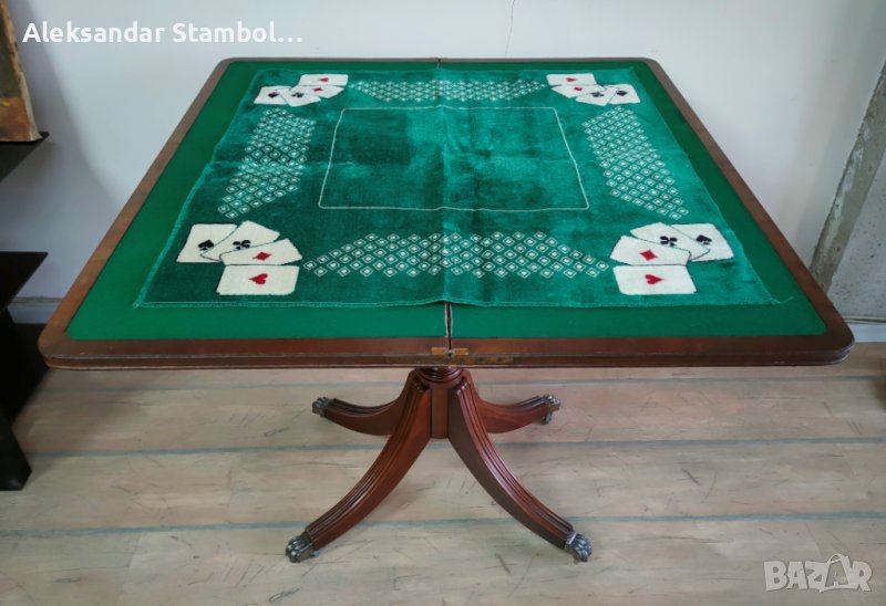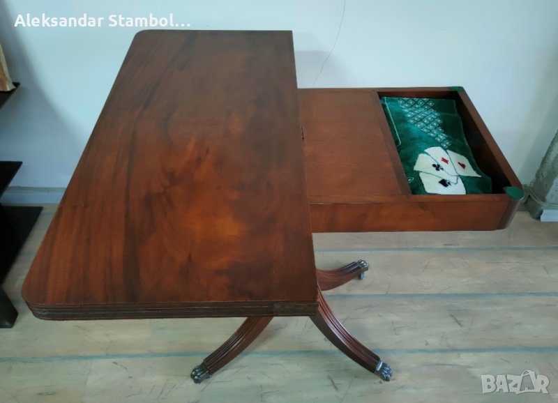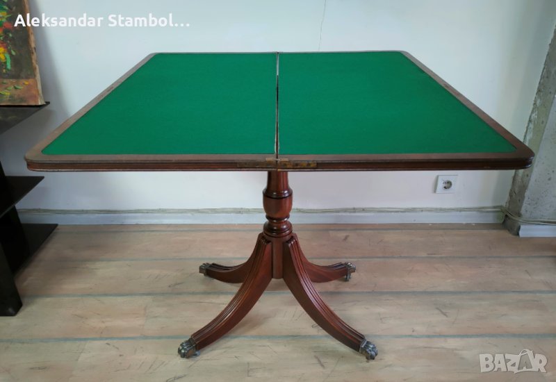 Уникална английска сгъваема маса за игра на карти от средата на 20 Век. В прекрасно състояние, оборудвана с колелца, размер разгъната - 85х85,5х76см. Оригиналната покривка за игра на карти налична. Ръчна изработка от фирмата "Bevan Funnell" Ltd. Плота се разгъва чрез завъртане и разтваряне. Напълно рестврирана.