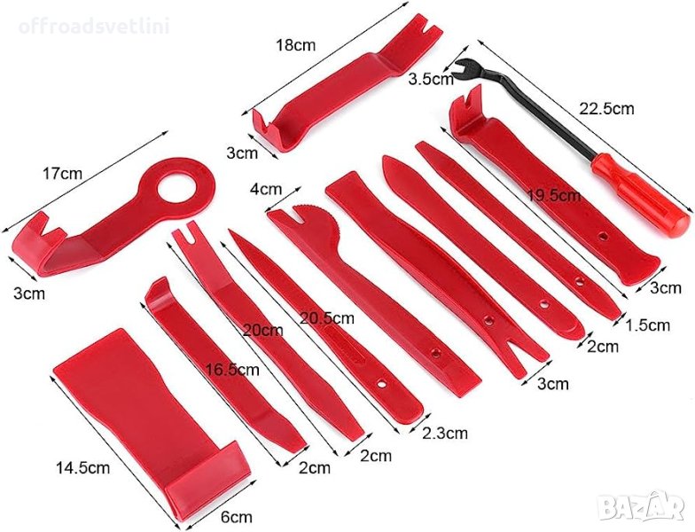 Комплект инструменти от 14 части - лостове, шини, шпатули, пластини, отвертки тип вилица(230мм и 306мм) за демонтаж и монтаж на авто аудио (радио, CD, мултимедия), кори, панели, плафони, табла, лайсни, говорители, тапицерии и други декоративни елементи на интериора и екстериора с цел улеснение и избягване на драскотини.